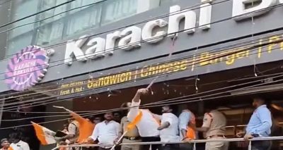 نفرت کی آگ میں جلتے چند شدت پسندوں نے بیکری کے باہر جمع ہو کر کراچی کے نام والے بورڈ کو ڈنڈوں سے توڑ ڈالا۔