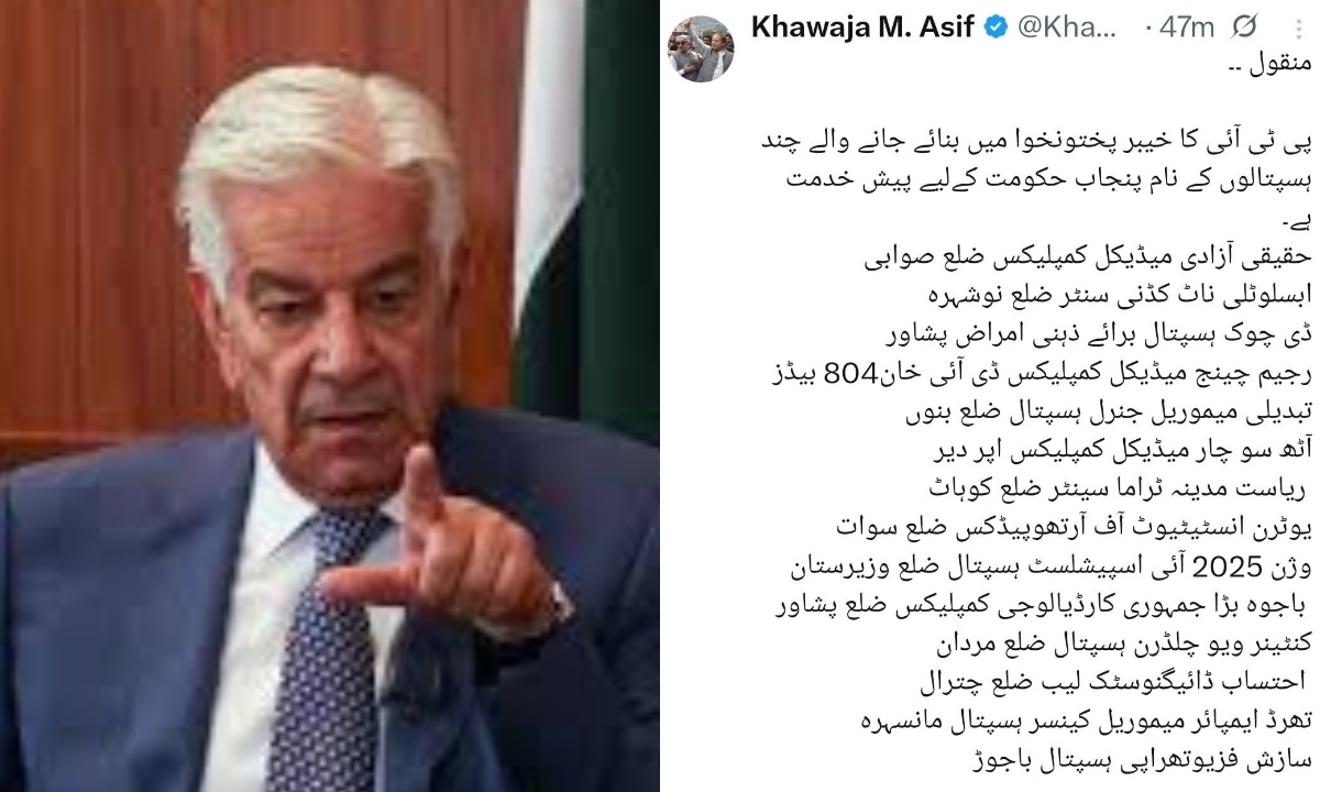 خواجہ آصف کی پی ٹی آئی کو جگتیں January 2, 2026 یہ فہرست پنجاب حکومت کے لیے “پیشِ خدمت” ہے۔ ان کے مطابق مذکورہ نام پی ٹی آئی کے بیانیے اور…