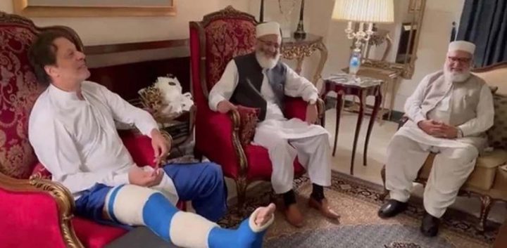 جماعت اسلامی کا وفدعمران خان کی عیادت کیلئے زمان پارک آمد November 9, 2022 جماعتِ اسلامی کے وفد میں لیاقت بلوچ، امیر العظیم اور قیصر شریف بھی شامل تھے۔