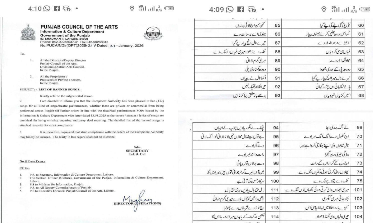 پنجاب میں بسنت پر 132 پنجابی گانوں پر پابندی عائد January 26, 2026 پابندی ہر قسم کی تھیٹر یا سٹیج پرفارمنس پر لاگو ہوگی، خواہ وہ نجی ہو یا کمرشل۔ نوٹیفکیشن