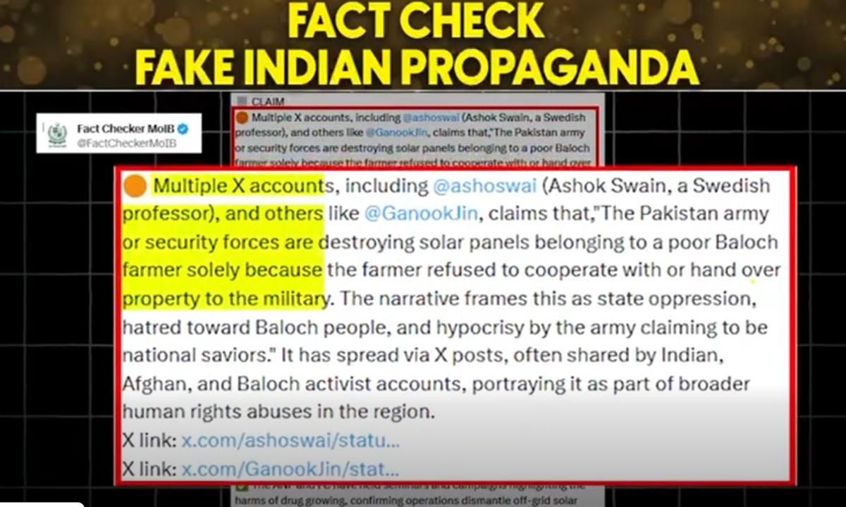 سولر پینلز سے متعلق پاکستان کے خلاف بھارتی اور افغان سوشل میڈیا پروپیگنڈا بے نقاب January 19, 2026 سوشل میڈیا پر ایک ویڈیو کے ذریعے یہ تاثر دینے کی کوشش کی گئی کہ پاکستانی فوج بلوچستان میں کسانوں…