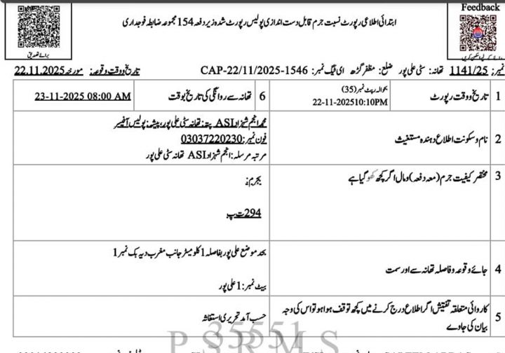 علی پورمیں کمپیوٹر اکیڈمی مالک کی نازیبا وڈیووائرل ہونے پر مقدمہ درج November 23, 2025 ملزم کو فوری طور پر گرفتارکرکے سخت ترین قانونی کارروائی عمل میں لائی جائے۔شہریوں کا مطالبہ