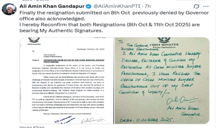 گورنر خیبرپختونخوا فیصل کریم کنڈی کے اعتراض پر گنڈا پور کا رد عمل October 13, 2025 اپنے دونوں استعفے 8 اور 11 اکتوبر کو اپنے مستند دستخط کے ساتھ جمع کرائے تھے 8 اکتوبر کا استعفیٰ،…